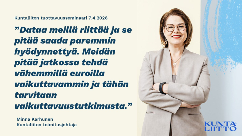 Mitä tulee kuntien tuottavuuteen tai sen mittaamiseen, dataa meillä riittää, mutta se pitää saada paremmin hyödynnettyä. Meidän pitää jatkossa tehdä vähemmillä euroilla vaikuttavammin, ja tähän tarvitaan vaikuttavuustutkimusta, painotti Kuntaliiton toimitusjohtaja Minna Karhunen Kuntaliiton Johtaminen x Ihmiset x Teknologia – Kuntatuottavuuden uusi aika -seminaarissa, joka järjestettiin Kuntatalolla eilen 7.4.2026.
