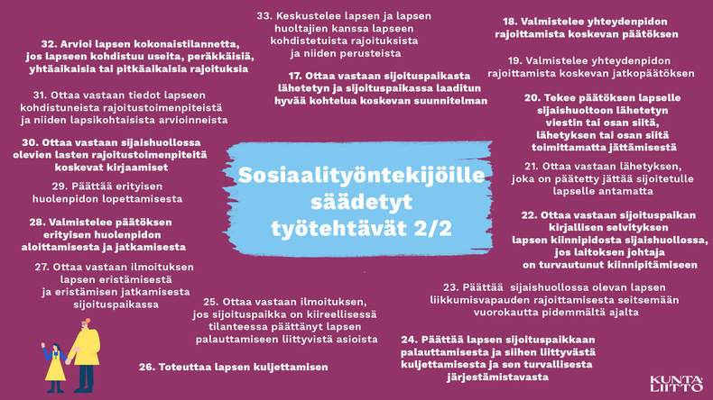 Lapsen asioista vastaaville sosiaalityöntekijöille on säädetty yli 30 virkatehtävää suoraan lailla