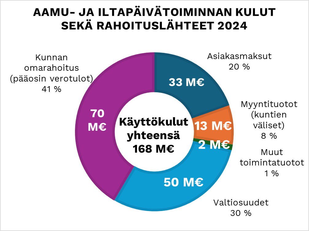 Vuonna 2024 aamu- ja iltapäivätoiminnan käyttökulut olivat n. 168 miljoonaa euroa. Kustannuskehitys on ollut nousujohteista viimeiset vuodet.