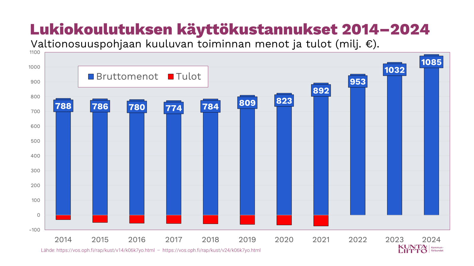 Lukiokoulutuksen kokonaiskustannukset vuonna 2024 olivat 1 085 miljoonaa euroa. Nämä ovat bruttokustannuksia, sillä Opetushallitus ei ole julkaissut kunnallisten lukiokoulutuksen järjestäjien valtionosuustoiminnan tuloja niiden kustannustiedon keruun siirryttyä Valtiokonttoriin vuonna 2022. Vuonna 2021 voimaan tullut oppivelvollisuuden laajentuminen nosti kustannuksia vielä vuonna 2024. Koulutuksen järjestäjät jatkoivat myös vahvaa panostamistaan lukiokoulutukseen. Lukiokoulutuksen kustannukset nousivatkin 5,1 prosenttia edellisestä vuodesta.
