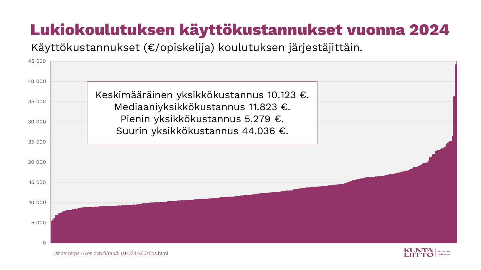 Keskimääräinen yksikkökustannus oli 10 123 euroa. Kustannusvaihtelu koulutuksen järjestäjien välillä oli luonnollisesti suurta vaihdellen vajaasta 5 300 eurosta yli 44 000 euroon. Suurimmat opiskelijakohtaiset kustannukset olivat ymmärrettävästi pienillä lukiokoulutuksen järjestäjillä. Kaikkiaan 19 koulutuksen järjestäjällä opiskelijakohtaiset kustannukset olivat yli 20 000 euroa. Kuvaavaa on, että näillä oli keskimäärin 36 opiskelijaa. Kaikkein pienimmät opiskelijakohtaiset kustannukset olivat vastaavasti aikuisten lukiokoulutuksen järjestäjillä.