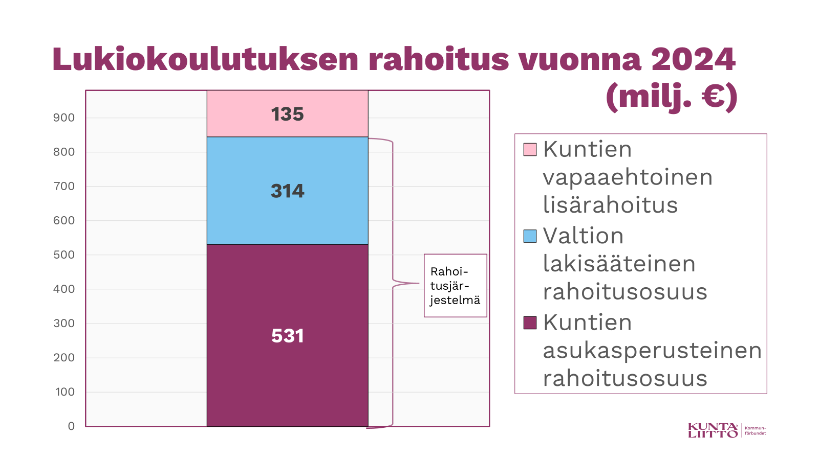 Lukiokoulutuksen rahoitus perustuu kuntien ja valtion yhteisrahoitukseen. Kunnat rahoittivat vuonna 2024 lukiokoulutuksen rahoitusjärjestelmää asukaslukuun perustuvan rahoitusosuutensa avulla lakisääteisesti 531 miljoonalla eurolla. Valtion rahoitusosuus oli pienempi eli 314 miljoonaa euroa. Tästä muodostui valtionosuutena koulutuksen järjestäjille jaettu 845 miljoonan euron rahoitus. Tämän lisäksi kunnat kompensoivat valtion rahoitusleikkauksia: ne rahoittivat lukiokoulutusta vielä 135 miljoonan euron vapaaehtoisella lisärahoituksella.