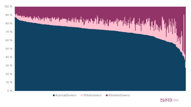 Verolajien keskinäisissä osuuksissa on myös suuria kuntakohtaisia eroja. Koko maan tasolla kunnallisveron osuus kuntien kaikista verotuloista on selvästi merkittävin, noin 70 prosenttia vuonna 2024. Yhteisöveron osuus on noin 13 prosenttia ja kiinteistöveron noin 17 prosenttia. Esimerkiksi Kustavissa ja Pelkosenniemessä, jossa on paljon vapaa-ajanasuntoja kiinteistöverotulot muodostavat jopa noin 60 prosenttia kunnan kaikista verotuloista. Samalla löytyy kuntia, joiden yhteisöverotulot lähentelevät noin kolmannesta tai jopa puolet kunnan kaikista verotuloista. Kunnallisveron osuus on joka tapauksessa merkittävin verolaji pääosassa kuntia.