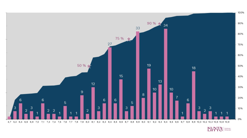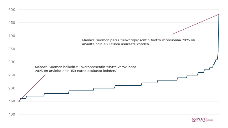 Kuva 3. Yhden kunnallisveroprosentin arvioitu tuotto verovuonna 2025, Manner-Suomen kunnat. Korkeimman ja matalimman kunnan välillä veroprosentin tuoton ero (euroa/asukas) on yli kolmikertainen