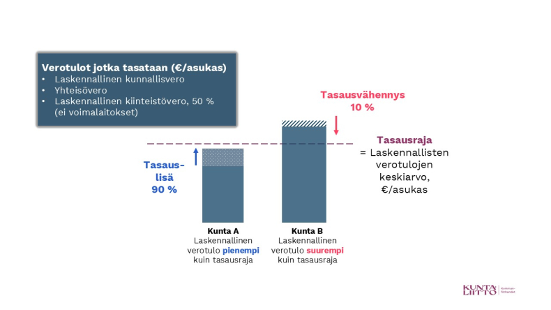 Tasauksen kuntakohtainen euromäärä perustuu siihen, miten paljon kunnan laskennallinen verotulo asukasta kohden eroaa Manner-Suomen keskiarvosta (=tasausraja). Jos kunnan laskennallinen verotulo asukasta kohden on pienempi kuin tasausraja, kunta saa tasauslisää 90 prosentin tasoon kunnan laskennallisen verotulon ja tasausrajan erotuksesta. Kunnan valtionosuuksiin tehdään puolestaan tasausvähennys, mikäli kunnan laskennalliset verotulot asukasta kohden ovat suuremmat kuin tasausraja. Tasausvähennys on 10 prosenttia tasausrajan ylittävältä osalta.