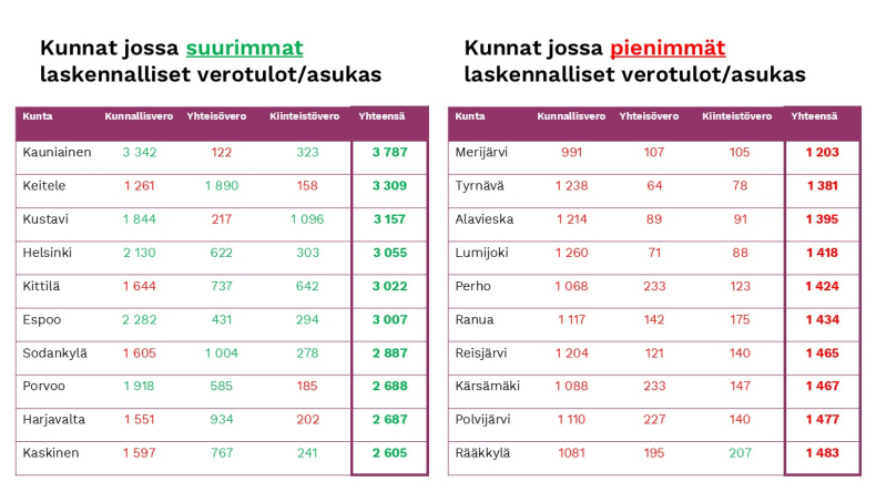 Kuntien verotulot eroavat merkittävästi ja samalla myös kuntien taloudelliset haasteet. Syntyvyyden lasku, ikääntyminen, keskittyvä maahanmuutto ja kaupungistuminen asettavat omanlaiset haasteet kaikentyyppisille kunnille. Verotuloissa erilaisuus ei välttämättä tarkoita, että kunta olisi talouden näkökulmasta toista huonompi tai parempi. Kaikki kunnat toimivat omilla vahvuuksilla. Mutta jos erilaisuus johtaa kohtuuttomiin veroprosenttieroihin, täytyy miettiä uusia ratkaisuja.
