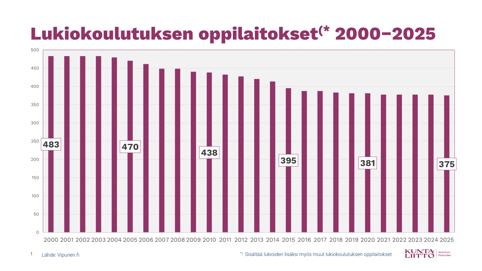 Kuva 1: Lukiokoulutuksen oppilaitosten lukumäärä vuosina 2000‒2025.