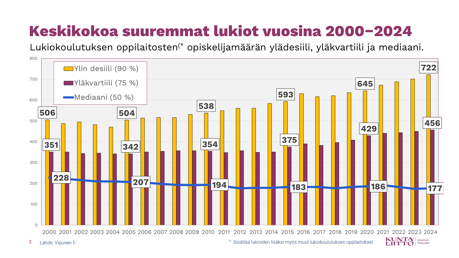 Kuva 2: Opiskelijamäärältään keskimmäistä lukiokoulutuksen oppilaitosta suurempien oppilaitosten koko vuosina 2000–2024.