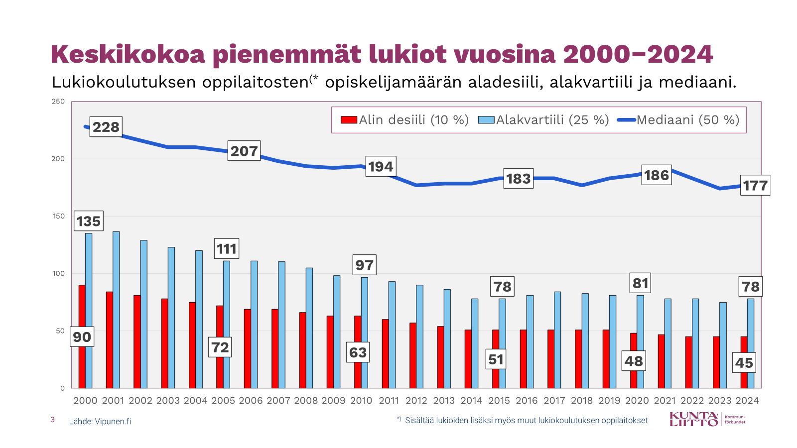 Kuva 3: Opiskelijamäärältään keskimmäistä lukiokoulutuksen oppilaitosta pienempien oppilaitosten koko vuosina 2000–2024.