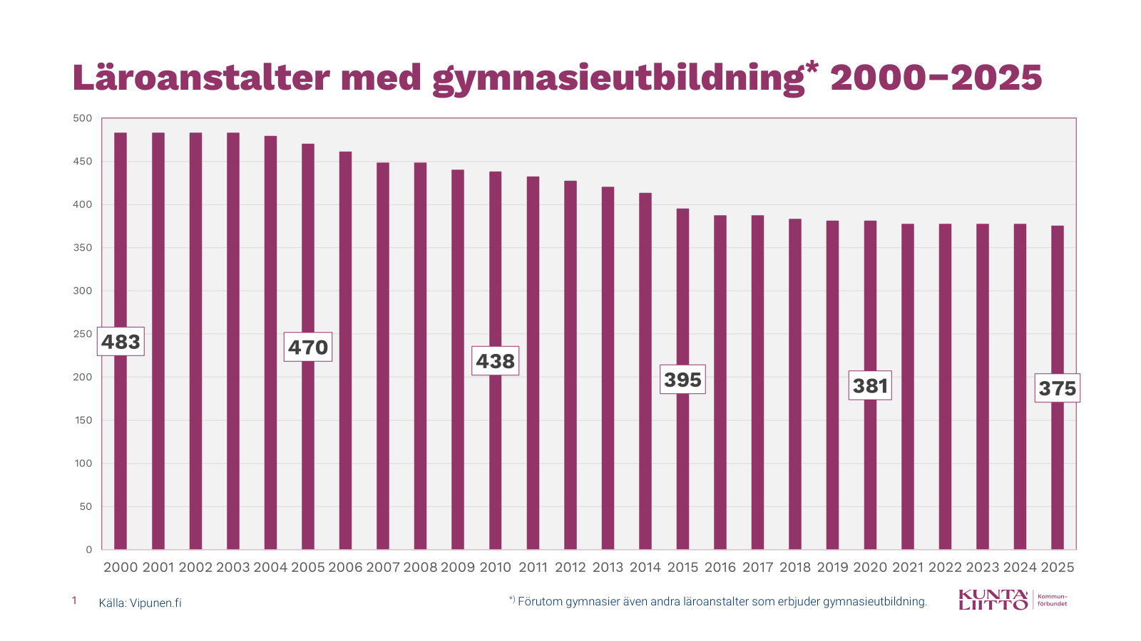 Förändringen i antalet gymnasier och andra läroanstalter som erbjuder gymnasieutbildning* samt i den övriga läroanstaltsstrukturen fortsätter. Hösten 2025 minskade antalet gymnasier med två, då samlyceet Kouvolan yhteislyseo bildades genom en sammanslagning av enheterna Kouvolan yhteislyseo, Kouvolan iltalukio och Kuusankosken lukio. Det är därför på sin plats att göra en snabb genomgång av förändringarna i antalet gymnasier och särskilt förändringarna i storleken på dem.