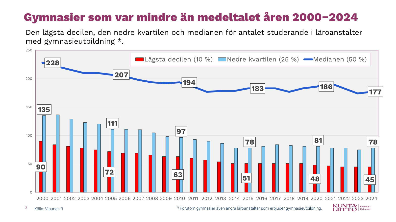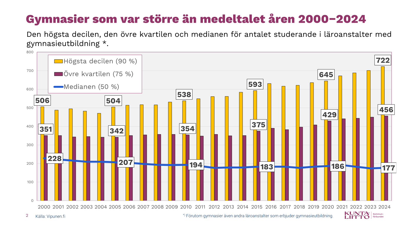 Det är dock motiverat att granska förändringarna i antalet studerande i gymnasierna ännu grundligare än med hjälp av mediantalet. Här kan kvartiler och deciler vara ännu mer informativa. Övre kvartilen är det tal som beskriver den nedre gränsen för antalet studerande i den fjärdedel av gymnasierna som hade mest studerande. År 2000 hade en fjärdedel av gymnasierna minst 351 studerande, och antalet studerande har efter det stigit med över 100 studerande. År 2024 måste antalet gymnasiestuderande redan vara 456 för att placera sig i fjärdedelen med de största gymnasierna.