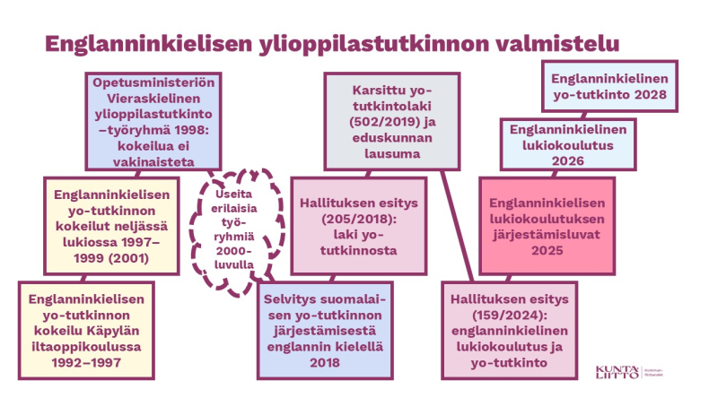 Kuva 2: Keskeiset vaiheet englanninkielisen ylioppilastutkinnon valmistelussa 1990-luvulta eteenpäin