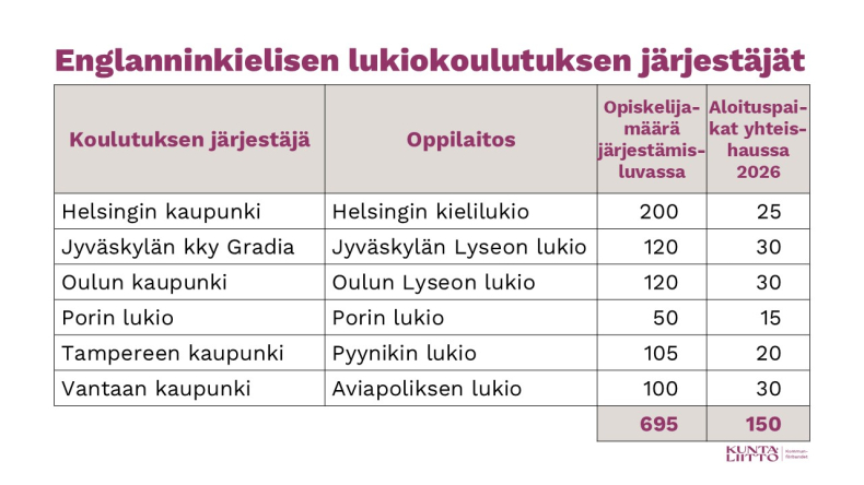 Englanninkielinen lukiokoulutus alkaa syksyllä 2026 ja se on mukana kevään yhteishaussa. Koulutuksen järjestäjät ovat asettaneet haettavaksi yhteensä 150 aloituspaikkaa, mikä tarkoittaa käytännössä kullakin järjestäjällä yhtä englanninkielistä ryhmää. Lisäksi Englantilaisessa koulussa on haettavana 20 erityisen koulutustehtävän mukaista opiskelupaikkaa. Vapaita opiskelupaikkoja on varattu myös kesken lukuvuoden tuleville hakijoille. On kiinnostavaa nähdä, miten englanninkielinen lukiokoulutus kiinnostaa yhteishaussa ja miten koulutus käynnistyy syksyllä 2026. Se periaatteessa vahvistaa koulutuksellista yhdenvertaisuutta, mutta toisaalta jää nähtäväksi, rajaavatko lainsäädännön tiukat ehdot kohderyhmän kovin pieneksi.