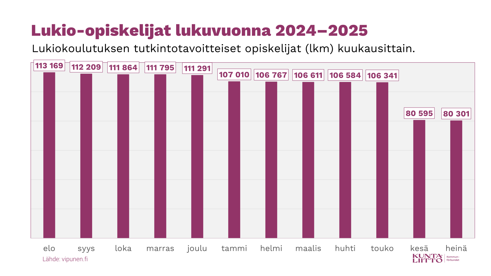 Kuva 1: Lukiokoulutuksen tutkintotavoitteisten opiskelijoiden määrä kuukausittain lukuvuonna 2024–2025