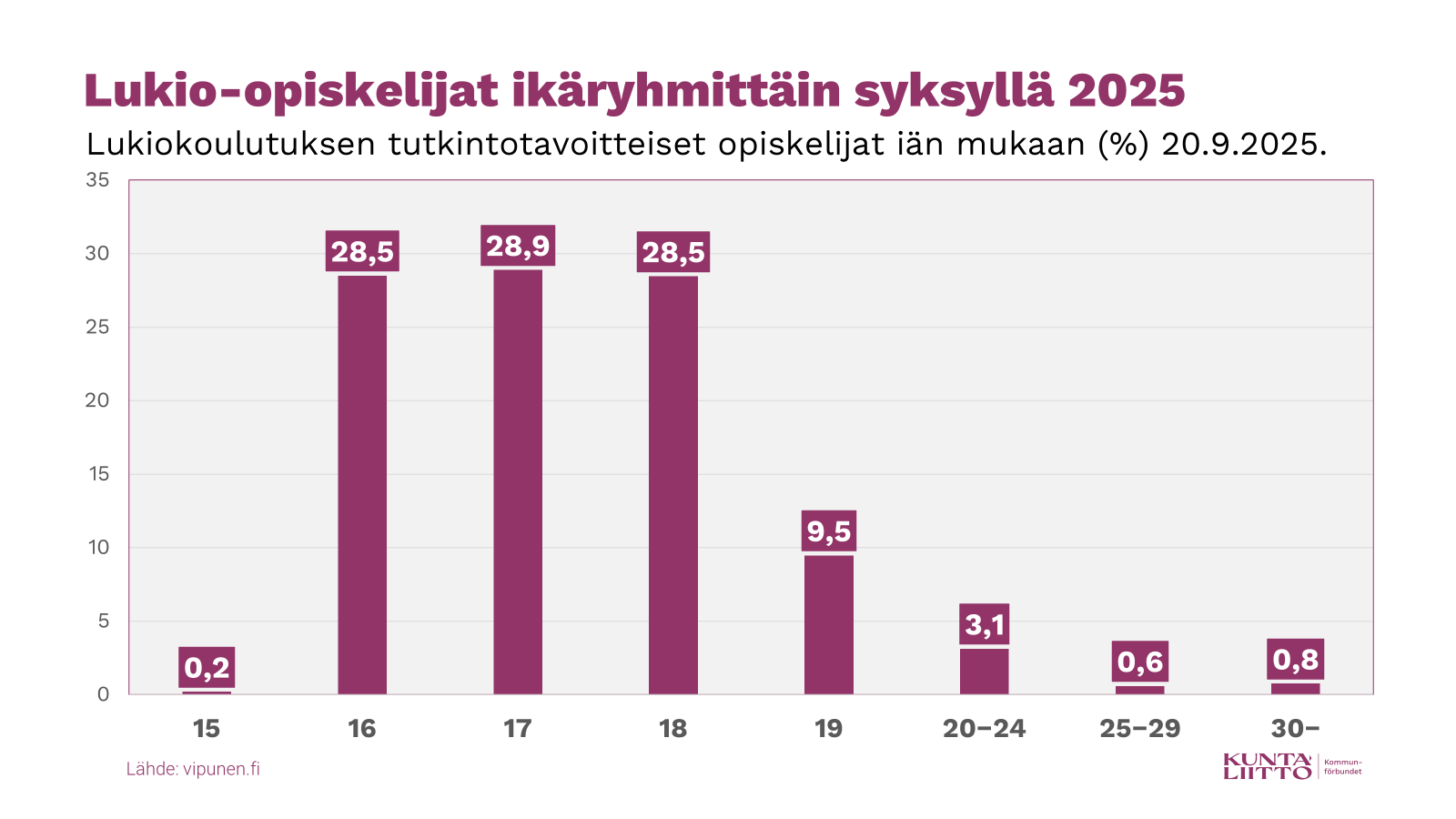 Kuva 2: Lukiokoulutuksen tutkintotavoitteisten opiskelijoiden ikäjakauma tilastointipäivänä 20.9.2025