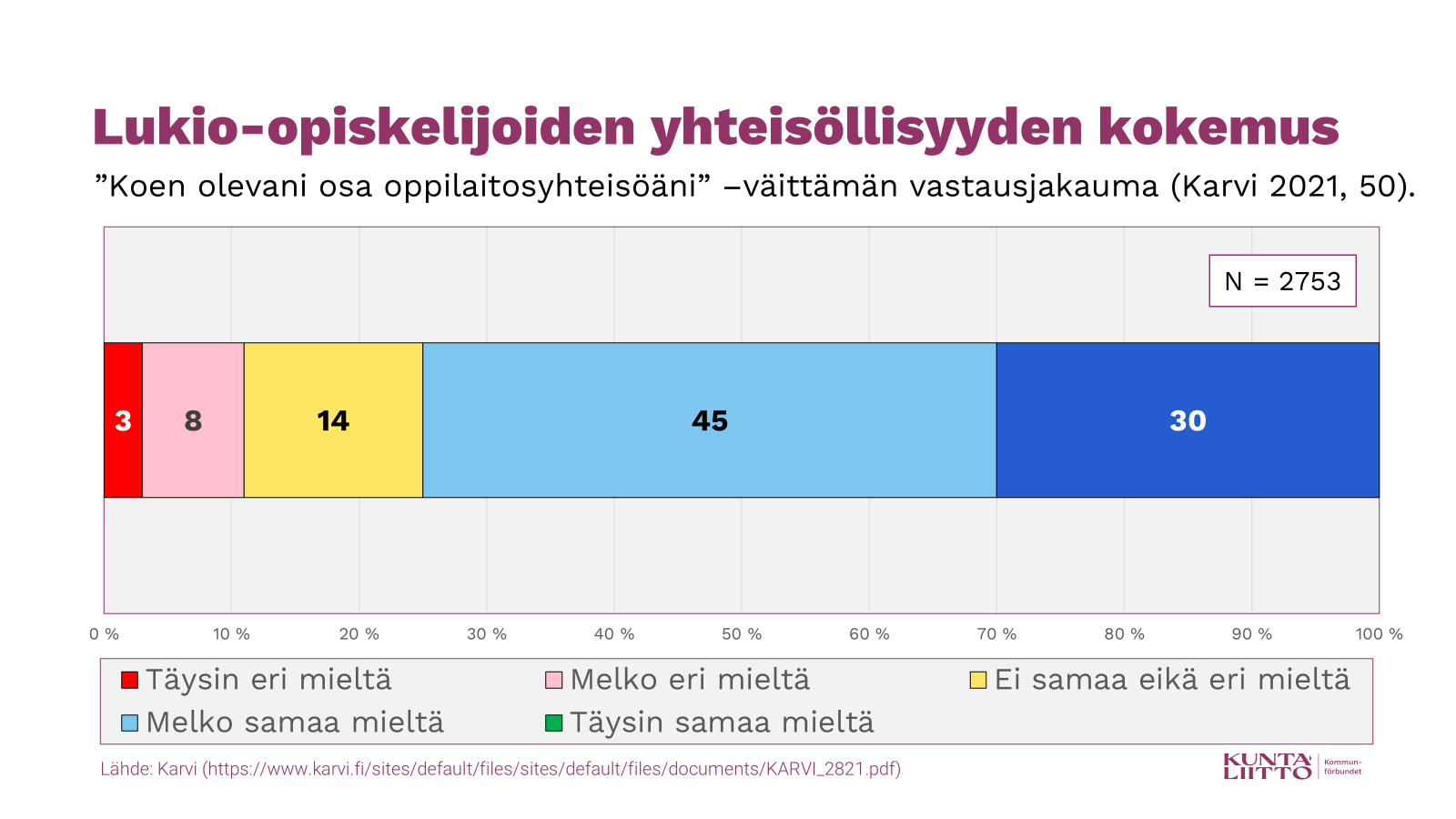 Kuva 3: Lukio-opiskelijoiden ilmaisema kokemus yhteisöllisyydestä ja oppilaitokseen kuulumisesta