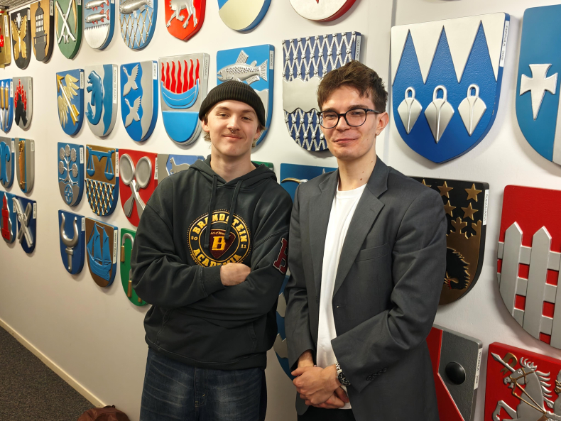 Kuva 4: Lukiolaisten liiton vuoden 2026 puheenjohtaja Pietari Meriläinen ja vuoden 2025 puheenjohtaja Veikka Ormio Kuntaliiton vaakunakäytävällä