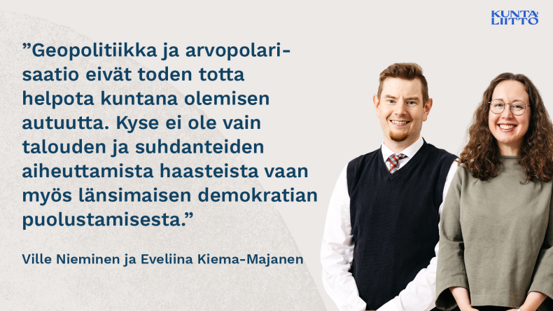 Geopolitiikka ja arvopolarisaatio, joiden heilahtelut ovat viimeistään viimeisen vuoden aikana säädelleet jumppapallon paineita edestakaisin, eivät toden totta helpota kuntana olemista. Kyse ei ole vain talouden ja suhdanteiden aiheuttamista haasteista vaan myös länsimaisen demokratian puolustamisesta.