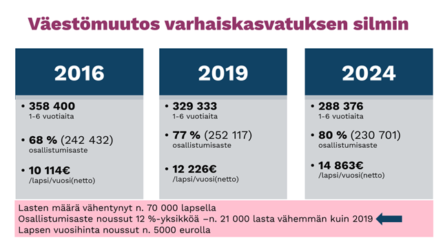 Varhaiskasvatuksen osallistumisasteen nostaminen on ollut jo usean hallituksen tavoitteena - edellisten ja nykyisenkin. Vuonna 2016 1–6-vuotiaista lapsista varhaiskasvatukseen osallistui noin 68 prosenttia, kun vuonna 2024 osallistumisaste oli kivunnut jo yli 80 prosenttiin. Muutos on merkittävä ottaen huomioon, että samanaikaisesti lasten määrä Suomessa väheni yli 70 000 lapsella.
