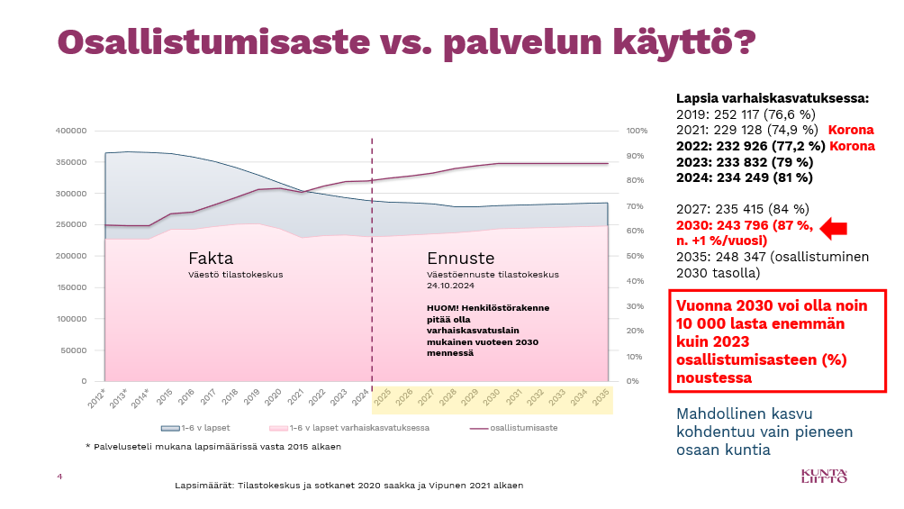Jos osallistumisaste edelleen kasvaa, voiko lasten määrä varhaiskasvatuksessa edelleen kasvaa? Mikäli lasten osallistuminen varhaiskasvatukseen edelleen kasvaa, kohdentuu varhaiskasvatukseen osallistuvien lasten määrän kasvu vain osaan kunnista. Suurin osa Suomen kunnista elää todellisuutta, jossa varhaiskasvatukseen osallistuvien lasten määrä vähenee, vaikka osallistumisaste nousisi. Lasten määrän kasvu varhaiskasvatuksessa kohdentuu todennäköisesti suurimpiin kaupunkeihin ja yksittäisiin muihin kuntiin.