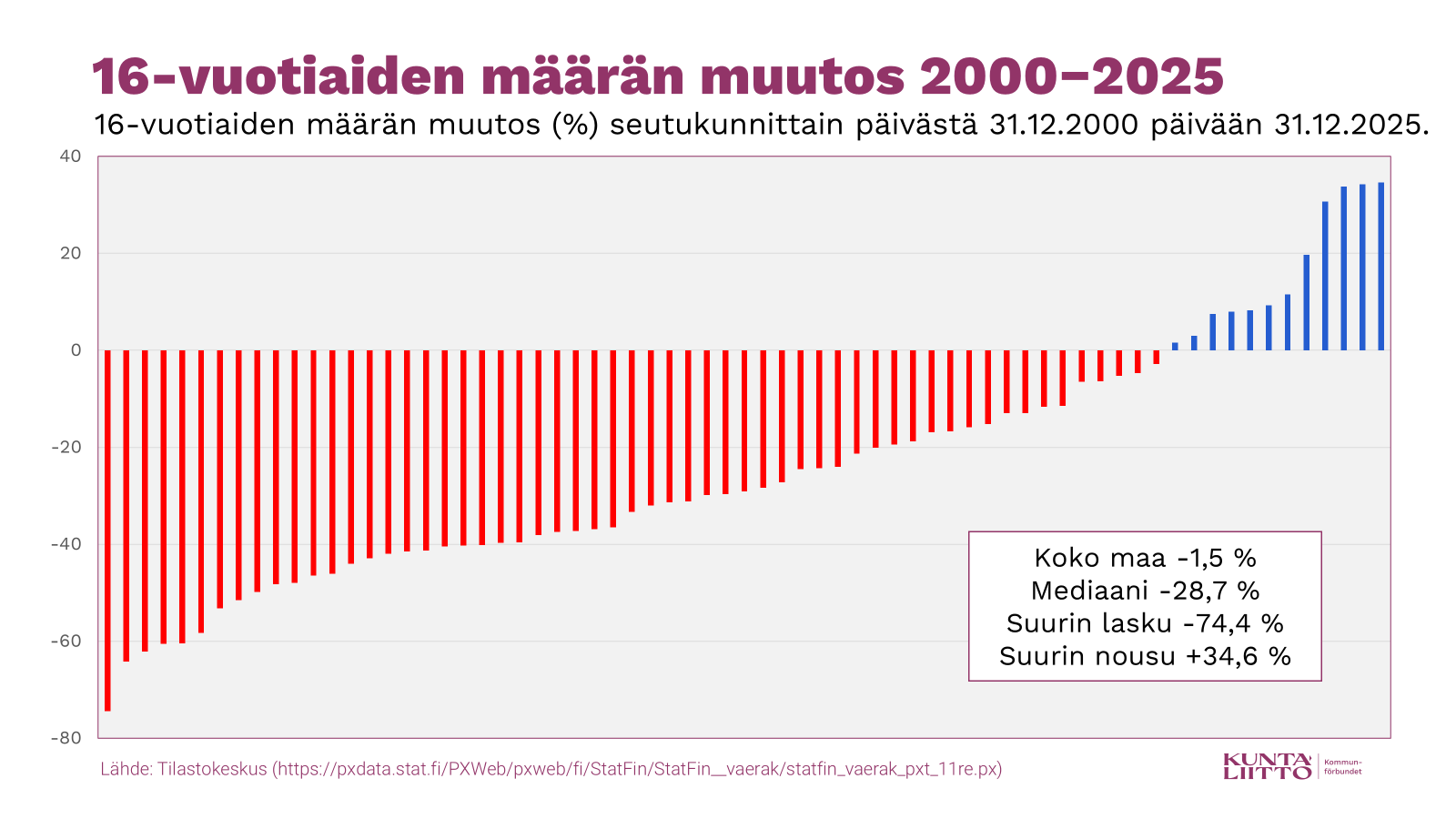 Kuva 1: 16-vuotiaiden määrän muutos (%) seutukunnittain vuodesta 2000 vuoteen 2025.