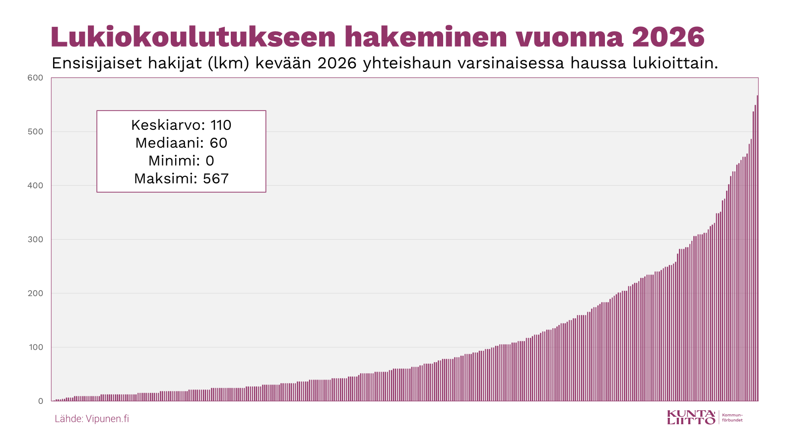 Kaikkiaan seitsemään lukioon oli kevään 2026 yhteishaun varsinaisessa haussa enintään neljä ensisijaista hakijaa. Kaikkiaan 24 lukioon oli enintään kymmenen ensisijaista hakijaa. Myös nämä luvut osoittavat, että nykyinen lukioverkko ei ole mitenkään itsestäänselvyys edes lähitulevaisuudessa.