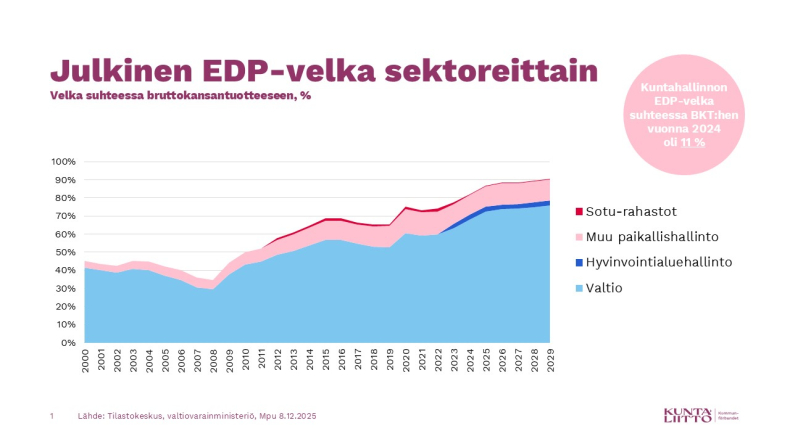 - Yhteensä julkisen sektorin EDP-velka nousi vuoden 2024 lopussa 226,6 miljardiin euroon, mistä kuntahallinnon osuus oli valtiovarainministeriön mukaan 30,0 miljardia euroa. Kuntahallintoon kuuluu kansantalouden tilinpidon paikallishallinto pl. Helsingin kaupungin sosiaali- ja terveydenhuolto sekä pelastustoimi sekä hyvinvointialuehallinto.