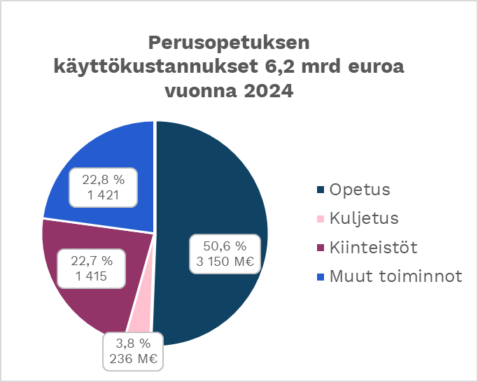 Kuntien tehtävänä on ylläpitää saavutettavaa kouluverkkoa ja huolehtia laadukkaasta opetuksesta kaikkialla Suomessa. Opetuksen kustannus ei ole erillään muista kustannustekijöistä perusopetuksen järjestämisen kokonaisuudessa. Kunnat vastaavat opetuksen lisäksi mm. oppimisen olosuhteisiin vaikuttavista tekijöistä kuten opetuksen tiloista sekä koulukuljetuksista. Hieman yli puolet kustannuksista kohdistuu kuitenkin opetukseen.