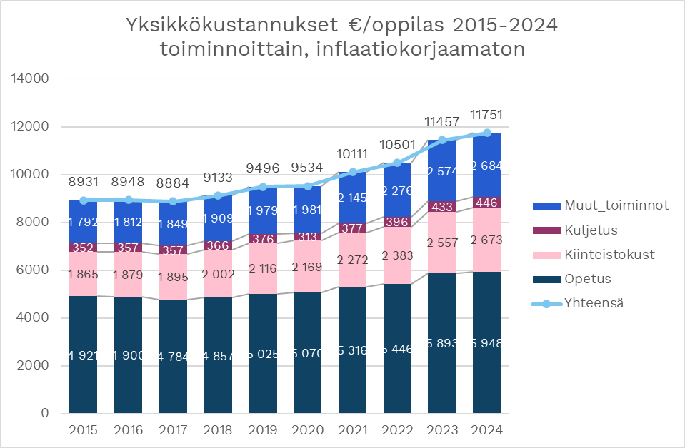 Kuva 2: Perusopetuksen yksikkökustannusten (€/oppilas) kehitys vuosina 2015-2024, inflaatiokorjaamaton