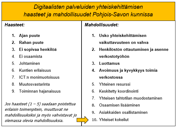 Digitaalisten palveluiden yhteiskehittämisen haasteita ja mahdollisuuksia on selvitetty, esimerkkinä Pohjois-Savon kuntien yhteistyö (Digitaalisten palveluiden yhteiskehittämisen haasteet ja mahdollisuudet Pohjois-Savon kunnissa, Petri Kejonen, Savonia 2021). Yhteiskehittämisen haasteiden osalta Kejosen havainnot ovat pitkälti samoja, kuin kuntien digitalisaatiokartoituksen havainnoissa.