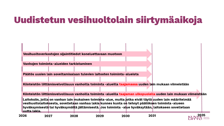 Liittämisvelvollisuuden muutokset tulevat voimaan, kun kunta on tarkistanut vesihuoltolaitosten toiminta-alueet uudistetun lain mukaisiksi, eli toiminta-alueen tarkistamisajankohdasta riippuen viimeistään 31.12.2030.Taajamien ulkopuolella liittämisvelvollisuuden muutos tulee voimaan kuitenkin vasta neljän (4) vuoden kuluttua edellä mainitusta toiminta-aluepäätöksestä silloin, jos alue on kuulunut toiminta-alueeseen jo aiemman lain mukaisesti.
