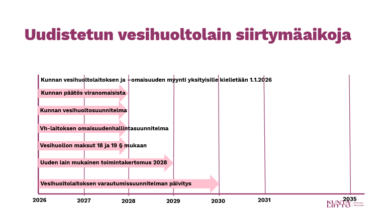 Vesihuoltolain (119/2001) uudistus tuli voimaan 1.1.2026. Samalla tuli voimaan kokonaan uusi, erityisesti uudistetun lain suunnittelu-, tiedotus- ja tiedontoimitusvelvoitteita koskevia säännöksiä täsmentävä valtioneuvoston asetus vesihuollosta (1173/2025). Lain tavoitepykälää on täsmennetty aiemmasta niin, että siinä tuodaan esille erikseen vesihuollon toimintavarmuus sekä se, että tavoitteena on täyttää talousveden osalta sekä terveydensuojelulain (763/1994) mukaiset laatuvaatimukset että -tavoitteet.